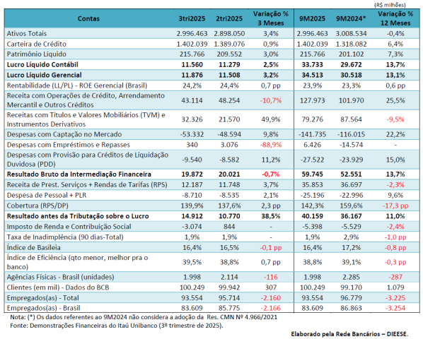 O Itaú Unibanco registrou um lucro líquido gerencial de R$ 34,5 bilhões nos nove primeiros meses de 2025, alta de 13,1% em relação ao mesmo período do ano passado, segundo levantamento do Dieese com base nas demonstrações financeiras do banco. O resultado confirma a trajetória de crescimento dos lucros e da rentabilidade da instituição, que atingiu 23,9% sobre o patrimônio líquido.