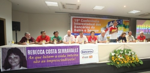 Os participantes da 19ª Conferência dos Bancários da Bahia e Sergipe prestaram justa homenagem à ex-dirigente do Sindicato dos Bancários da Bahia e funcionária da Caixa Econômica Federal, Rebecca Serravalle, falecida em 24 de junho deste ano. Logo no abertura do evento, ficou decidido por unanimidade, que Conferência receberia o seu nome.