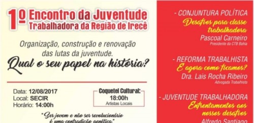 Acontece no próximo sábado(12/8), às 14h, no auditório do SECIR - Sindicado dos Empregados no Comércio de Irecê e Região, o 1º Encontro da Juventude Trabalhadora com o mote "Organização, construção e renovação das lutas na juventude - Qual o seu papel na história?". Promovido pela CTB Bahia e CTB Regional Irecê, o evento pretende reunir e mobilizar os jovens de todas as categorias da região, convidados pelas entidades sindicais e movimentos sociais do território de Irecê (BA).