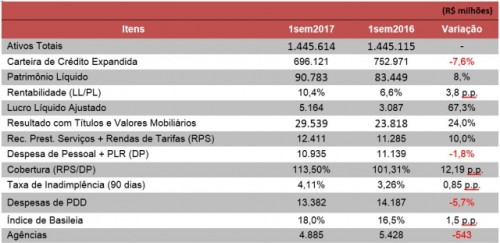 Os dados do relatório mostram que a Carteira de Crédito Expandida do banco caiu 7,6% em doze meses e atingiu R$ 696,1 bilhões (ligeiro crescimento de 1,1% no semestre). As operações com pessoas físicas caíram 2% em relação ao 1º semestre de 2016, mas ficaram estáveis nos seis primeiros meses de 2017, chegando a R$ 185,9 bilhões. As operações com pessoas jurídicas alcançaram R$ 277,2 bilhões, com queda de 15,4% em doze meses e de 1,3% no semestre. Já as operações com o agronegócio cresceram 2% em doze meses e, em relação ao primeiro semestre, o crescimento foi de 4,5%. O Índice de Inadimplência superior a 90 dias apresentou alta de 0,85 pontos percentuais no período, ficando em 4,11%. As despesas com provisões para créditos de liquidação duvidosa (PDD) caíram 5,7%, totalizando R$ 13,4 bilhões.