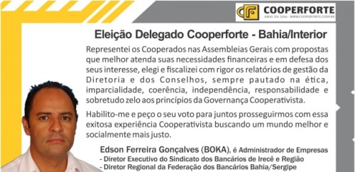 O interior da Bahia elegerá um representante. O Sindicato dos Bancários de Irecê e Região, apoia a candidatura de Edson Ferreira Gonçalves (BOKA) com o número 120256. Edson faz parte da Diretoria do Sindicato de Irecê, da Federação dos Bancários da Bahia e Sergipe e é o atual Delegado Seccional Bahia/Interior da Cooperativa.
