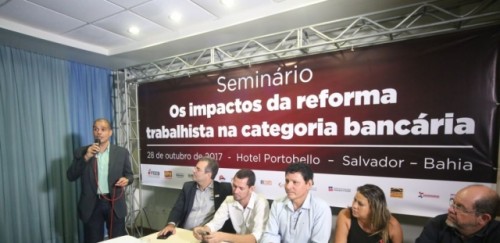 Para debater os impactos da Reforma Trabalhista na categoria bancária, aconteceu neste sábado (28), no Hotel Portobelo, em Salvador, o Seminário Jurídico da Federação dos Bancários da Bahia e Sergipe. Esteve presente um público de 130 participantes, formado por bancários, advogados trabalhistas e representantes dos sindicatos filiados da Federação. Pela manhã, foram discutidos o papel dos sindicatos diante da Reforma e a terceirização irrestrita.