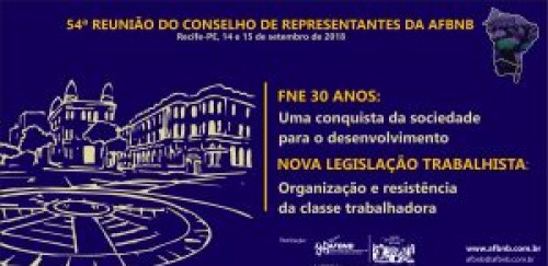Com os temas “FNE 30 anos: Uma conquista da sociedade para o Desenvolvimento” e “Nova Legislação Trabalhista: Organização e resistência da classe trabalho”, a 54ª Reunião do Conselho de Representantes de base da Associação dos Funcionários do Banco do Nordeste do Brasil (AFBNB) começa nesta sexta-feira (14/9), e segue até sábado (15), no Hotel Onda Mar, em Recife (PE).