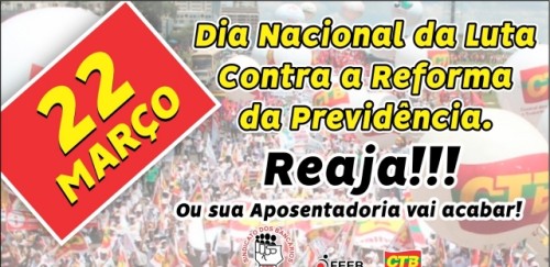 Amanhã (22), será um dia de resistência contra a proposta de reforma da Previdência (PEC 6/2019), e as centrais sindicais, os movimentos sociais e sindicatos vão às ruas para informar melhor aos trabalhadores e trabalhadoras sobre os danos da proposta e contra o fim da aposentadoria.
