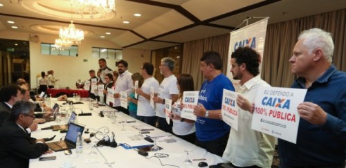 Um dos momentos mais marcantes e surpreendentes dessa negociação foi a realização do ato em defesa da Caixa 100% pública e por nenhum direito a menos, quando os representantes dos empregados se levantaram da mesa e ficaram de pé, portando cartazes e estendendo banners reafirmando a luta para que a direção do banco apresente propostas efetivas contra a retirada de direitos e pela manutenção do papel social da empresa, caracterizado como “estratégico para o desenvolvimento do país”. O protesto reafirmou ainda que os empregados, junto com outros trabalhadores, estão mobilizados por mais democracia, mais diálogo e contra a retirada de direitos.